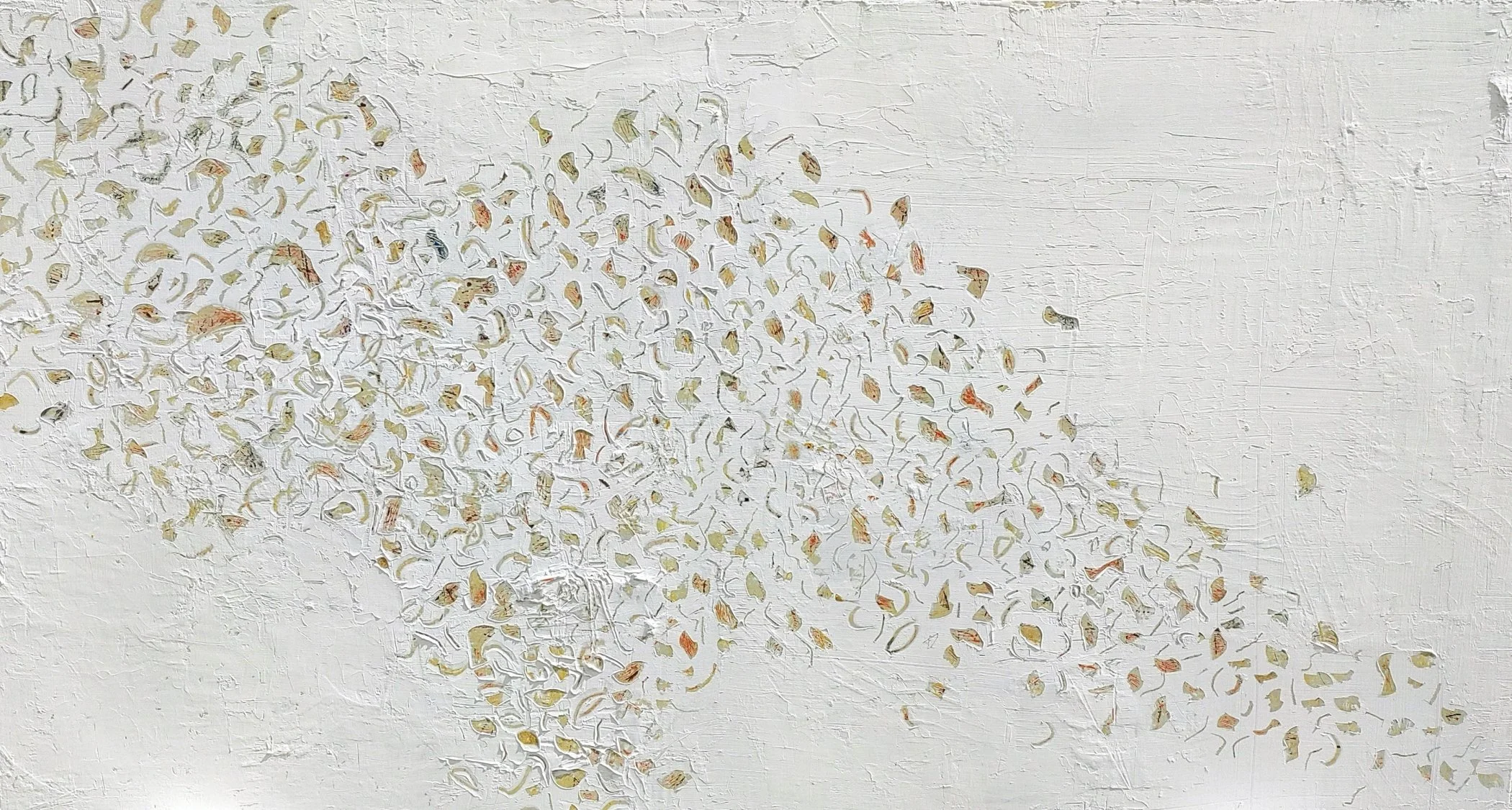 The idea behind Harrison’s work, both in her paintings and clinical work, is not the restoration of one’s original state, but the transformation and integration of parts of the self that are wounded, messy, and confused, into a cohesive, beautiful, and lively whole. It is the discovery of a new way of being through the act of taking back layers, “to get back to some of the state of origin, that is never quite what it was ever again—but something more wise, more worn, more beautiful in all its experience.